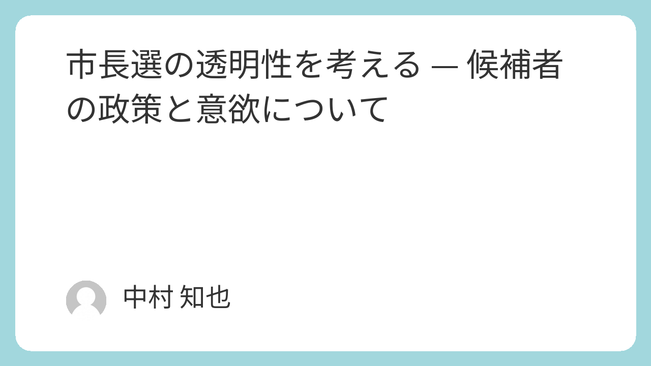 「皆さん、こんにちは。秦野市議会議員の中村知也です。私は佐藤伸一候補を支持していることを公言していますが、選挙の公正さを重視し、すべての候補者に敬意を払っています。この記事は私の個人的見解で、選管確認なしのものです。もし問題があれば修正します。秦野市長選では、候補者の陣営の動きや選挙意欲が市民に十分伝わっていない場合があります。例えば、選挙カーの有無やホームページの更新状況が不明瞭な候補もいるようです。また、過去の会話の印象から、勝負けにこだわらない姿勢が見られる場合もあります。一般的に、候補者が当選した場合の任期全うの覚悟や、選挙中の状況(例: 議員辞職の可能性に関する情報)が不透明だと、市民の不安を招きます。これらの点について、候補者の皆さんに市民の皆さんのために説明いただけるとありがたいと思います。皆さんの意見も聞かせてください。秦野市の未来のため、政策の透明性を一緒に考えましょう。