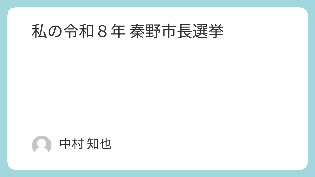 私の令和8年 秦野市長選挙 2026.01.27 さとう伸一応援者の皆様へいつもさとう伸一を温かく支えてくださっている皆様、中村知也です。この度は、令和8年1月25日執行の秦野市長選挙において、皆様の多大なるご支援とご尽力をいただきましたこと、心より感謝申し上げます。選挙戦を通じて、多くの方々と出会い、秦野市の未... 2026年秦野市長選挙 公開討論会「皆さん、こんにちは。秦野市議会議員の中村知也です。私は佐藤伸一候補を支持していることを公言していますが、選挙の公正さを重視し、すべての候補者に敬意を払っています。この動画は、秦野市の未来を担うリーダーを決める「2026年秦野市長選挙」に向... 市長選の透明性を考える — 候補者の政策と意欲について「皆さん、こんにちは。秦野市議会議員の中村知也です。私は佐藤伸一候補を支持していることを公言していますが、選挙の公正さを重視し、すべての候補者に敬意を払っています。この記事は私の個人的見解で、選管確認なしのものです。もし問題があれば修正しま... 【期日前投票】秦野市長選投票率向上への呼びかけ秦野市民の皆様へ私は秦野市議会議員の中村知也です。この度、1月18日の告示から現在に至るまで、私のXアカウントおよびFacebookアカウントにおいて、秦野市市長選挙に関する情報を広く収集し、発信してまいりました。候補者の政策や選挙の意義、... 前回(令和4年)の秦野市長選挙の投票率令和4年1月23日執行 秦野市長選挙 年代別投票率年齢区分有権者数投票者数投票率10歳代2,88965222.57%20歳代14,0632,23415.89%30歳代14,8303,61424.37%40歳代22,2146,73230.31... Tweets by TomoyaNakamu